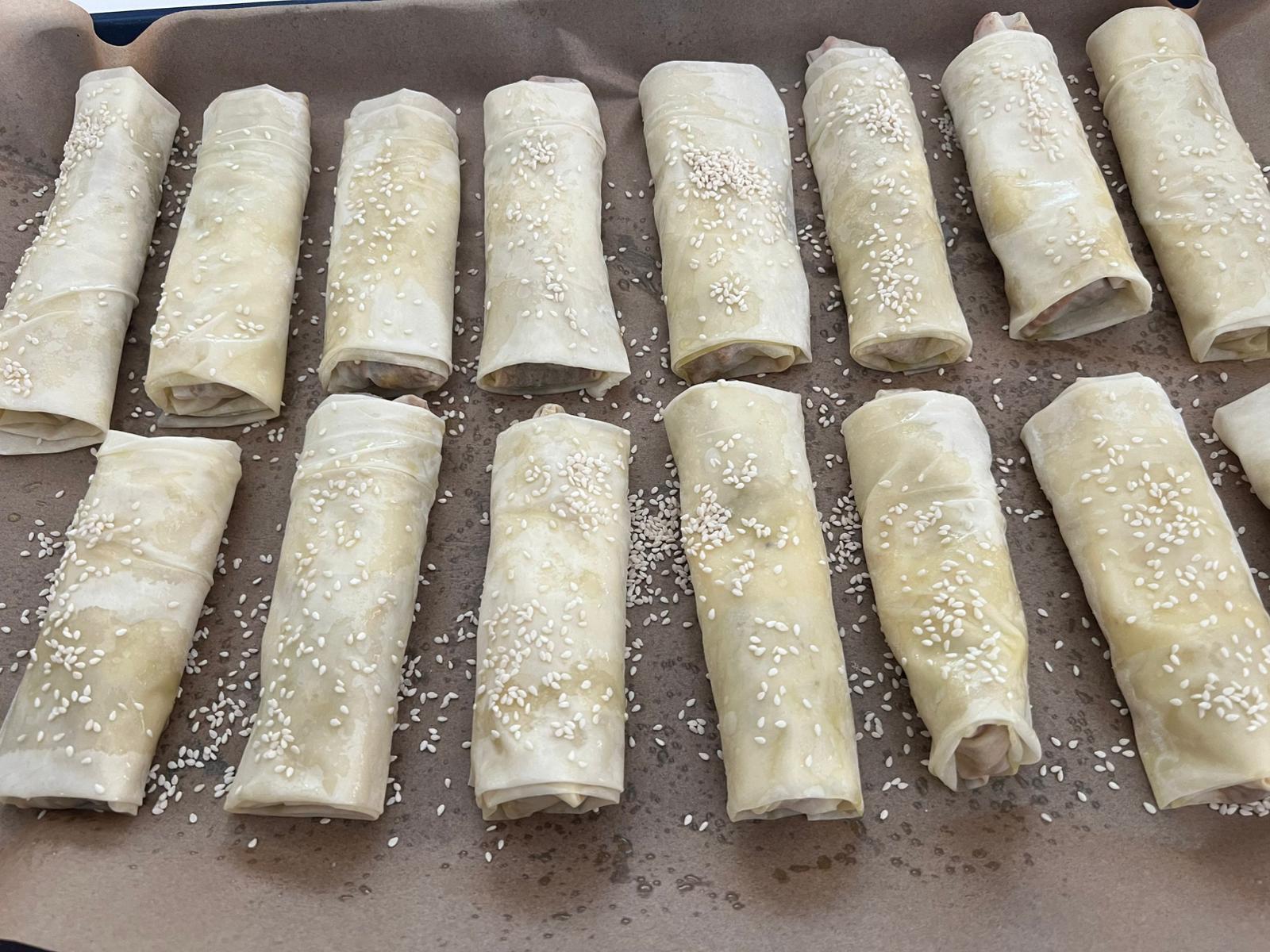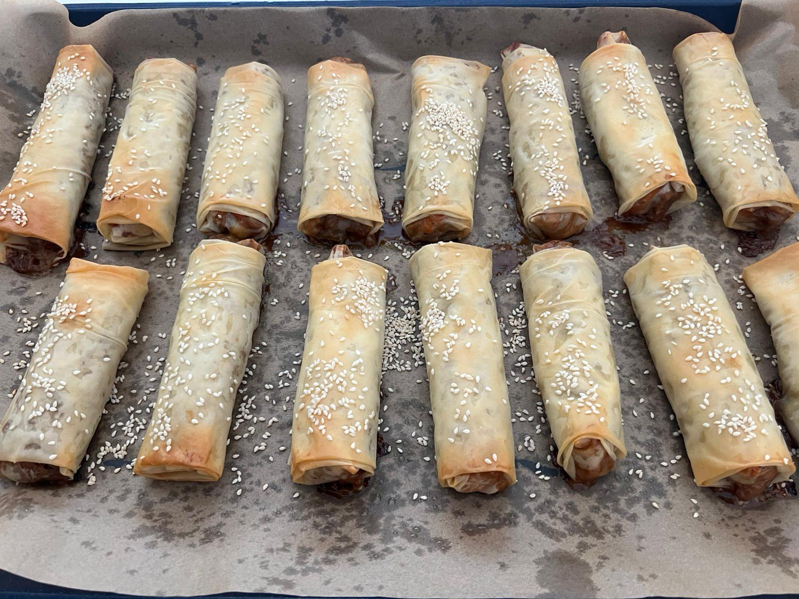 - פותחים את עלה הפילו מורחים מעט שמן ,שמים כף נדיבה מהמלית במרכז התחתון של העלה המלבני. מקפלים משני הצדדים לכיוו המרכז שהמילוי לא יברח מפזרים מעט פרורי לחם ומגלגלים עד למעלה