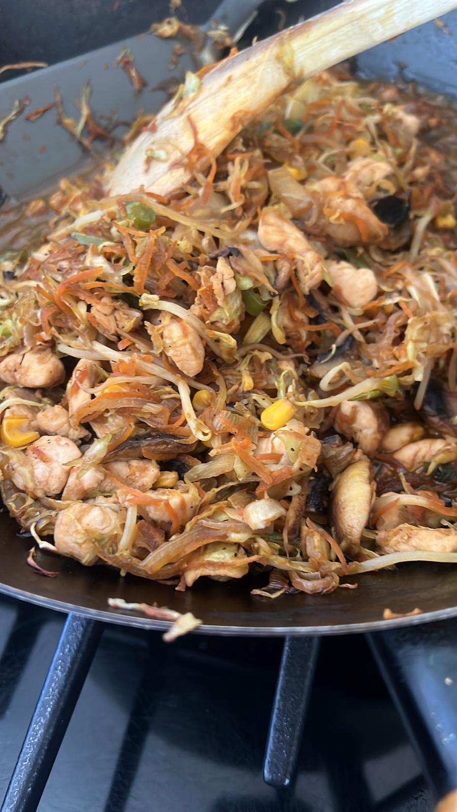 - מוסיפים את הכל לירקות המוקפצים ומערבבים הכל יחד