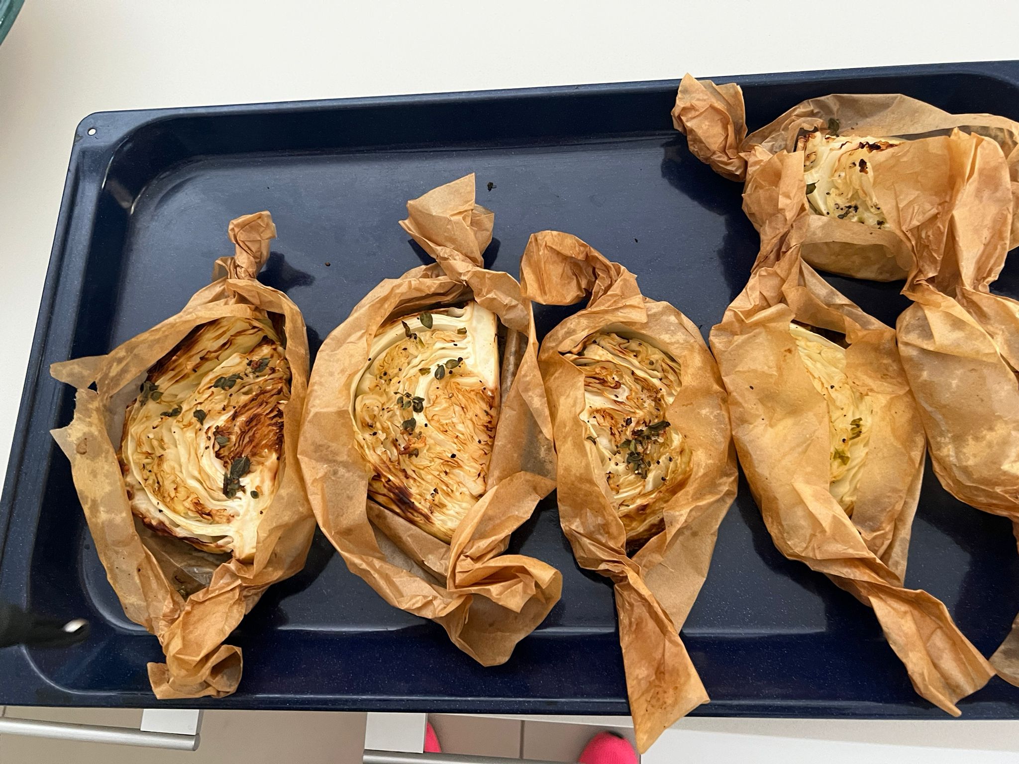 - פורסים את הכרוב ל 4 פרוסות עבות