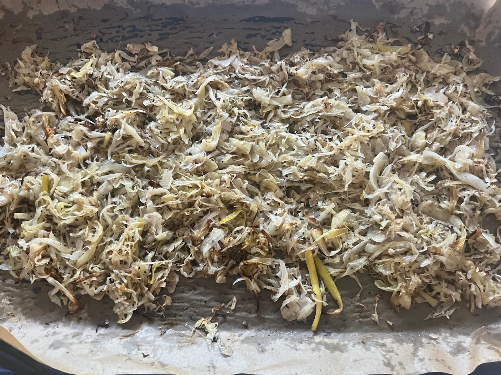 - במהלך הצלייה פותחים מידי פעם ,מערבבים ומשטחים שוב-כדי שכל הכרוב יקבל צלייה אחידה ופריכות.