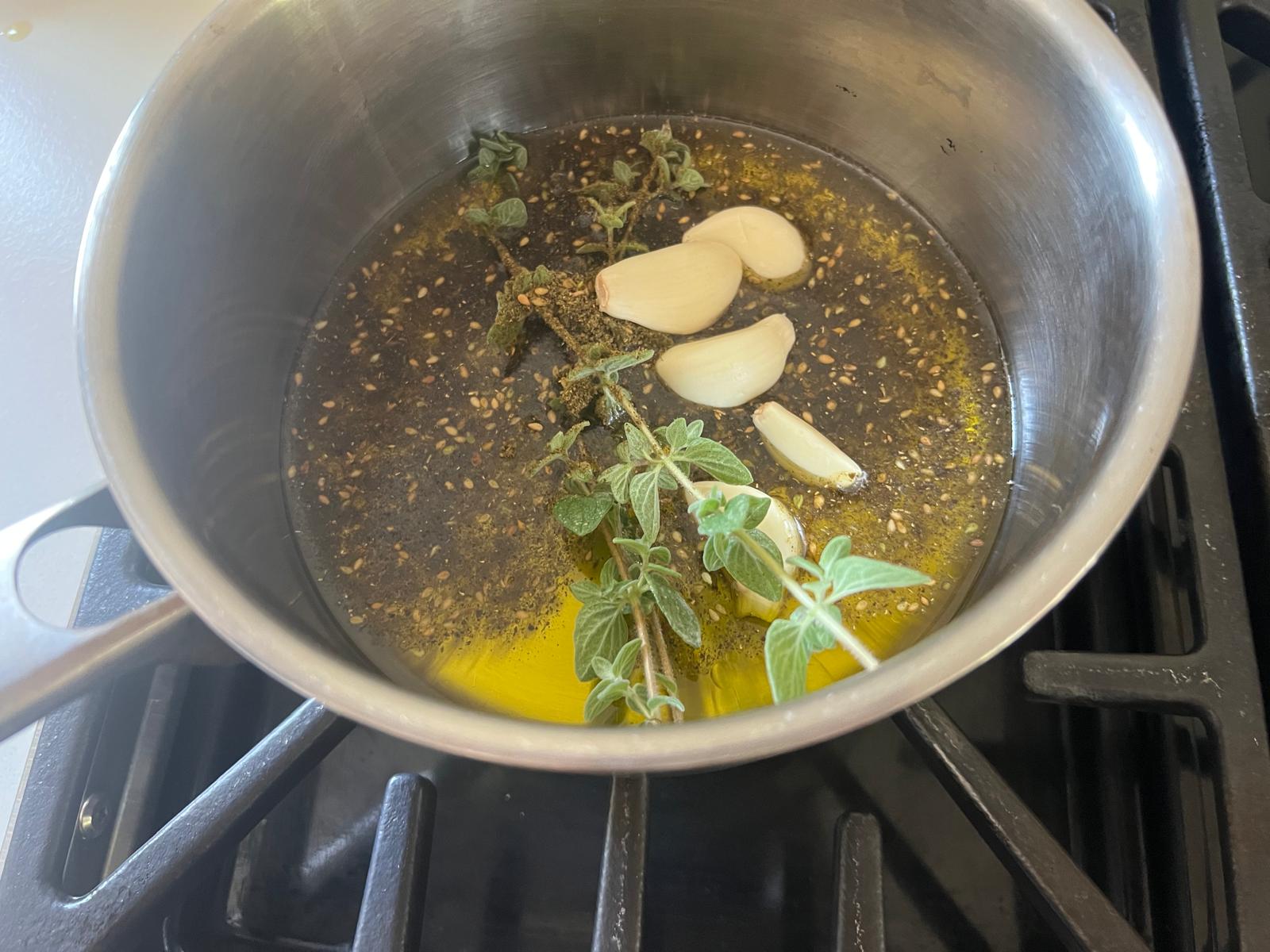 - מחממים בסיר קטן את השמנים יחד עם השום,הטימין,והזעתר הטרי